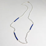This is the perfect layering necklace. Thin sterling silver chain necklace is accented with lapis lazuli beads and strung on a high strength beading wire.