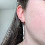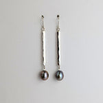 These Bar Pearl Earrings are crafted from sterling silver and feature cultured purple-gray pearls at the end of a hammer textured bar. These earrings are fabricated with ear hooks.