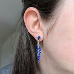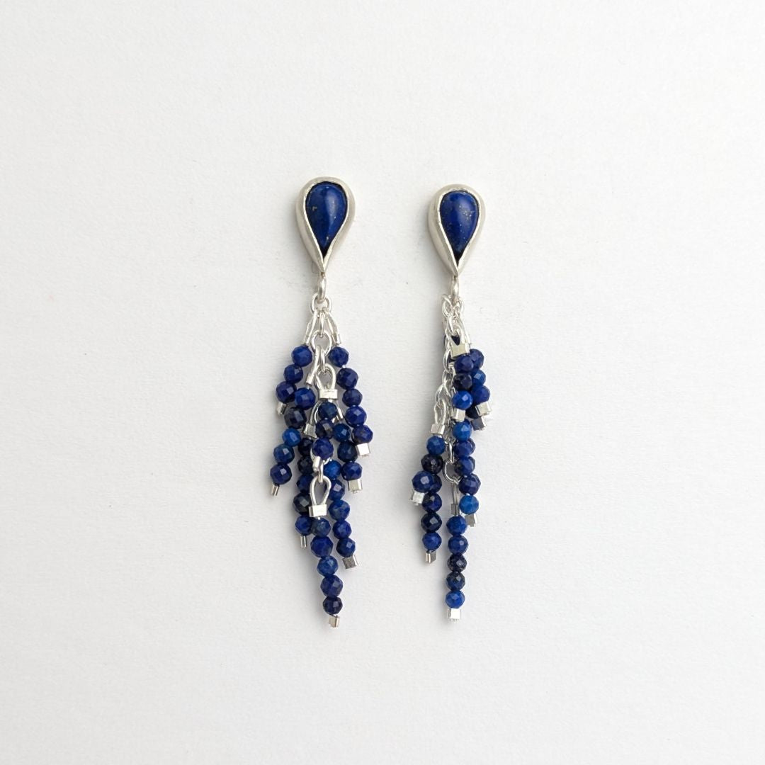 These eye-catching earrings showcase a lengthy tassel of lapis lazuli beads strung on durable beading wire and anchored with sturdy stud tops. The stud tops feature pear shaped lapis lazuli cabochons bezel set in sterling silver.