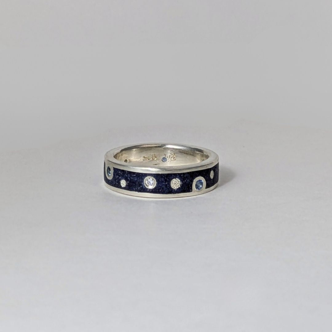 This Blue Sapphire Dotted Band showcases a series of 2mm Montana Sapphires, accented with diamonds and set into the intricately patterned sterling silver ring. The recessed areas are inlaid with crushed bluestone, perfectly complementing the stunning blue of the sapphires.