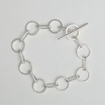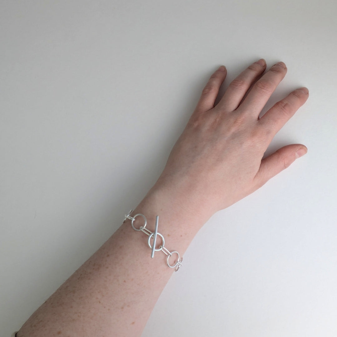 This chain is light- weight and is offered in both polished and oxidized sterling silver. The Circle Chain is made by hand and is sold at a variety of lengths to match your personal needs. The clasp on the circle chain bracelet is a toggle clasp.