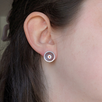 These stud earrings feature a 2mm light orange citrine with a ring of inlaid red jasper set in solid sterling silver. These studs come with large ear nuts to balance the large stud front.