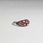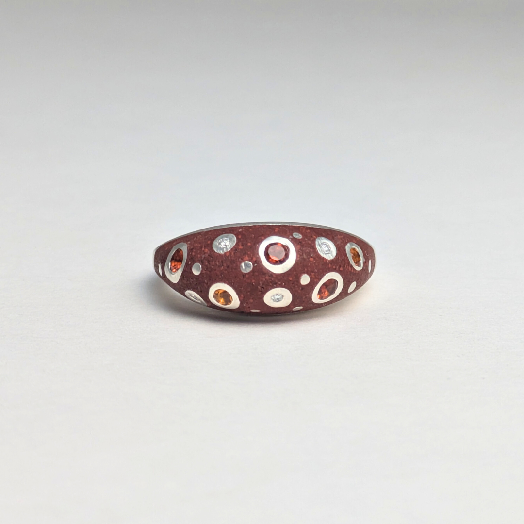 The dome profile of this ring is enhanced by the striking red jasper stone inlay. Accenting the deep red of the red jasper is the combination of madeira citrines and traditional yellow/orange citrines and white diamonds. This ring is crafted using solid sterling silver, with a polished finish for added shine.