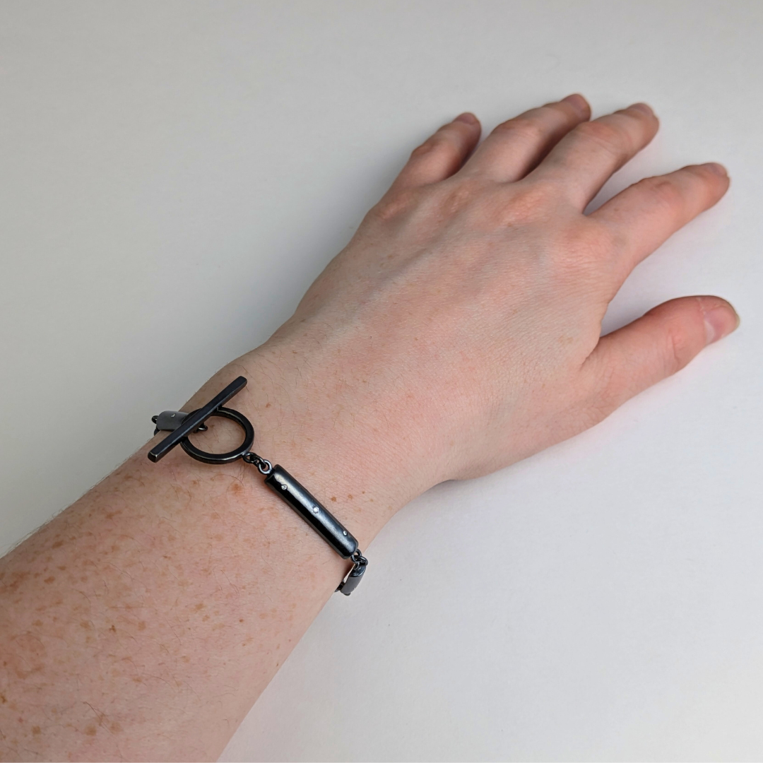 The Diamond Bar Bracelet is crafted with alternating lengths of half round sterling silver rod, held together by a hand made toggle clasp. Scattered diamonds adorn each link, providing a beautiful contrast against the oxidized sterling silver finish, resulting in a timeless and elegant design.