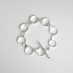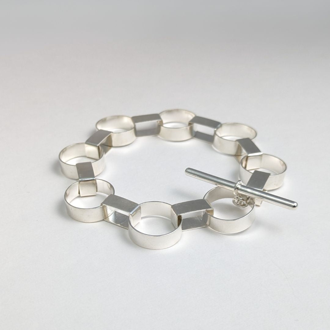 This bracelet is lightweight and made from solid sterling silver. Each link is hand-formed and soldered. The final round link doubles as part of the toggle clasp, with a round bar as the fastener, bringing both function and style to this bracelet design.