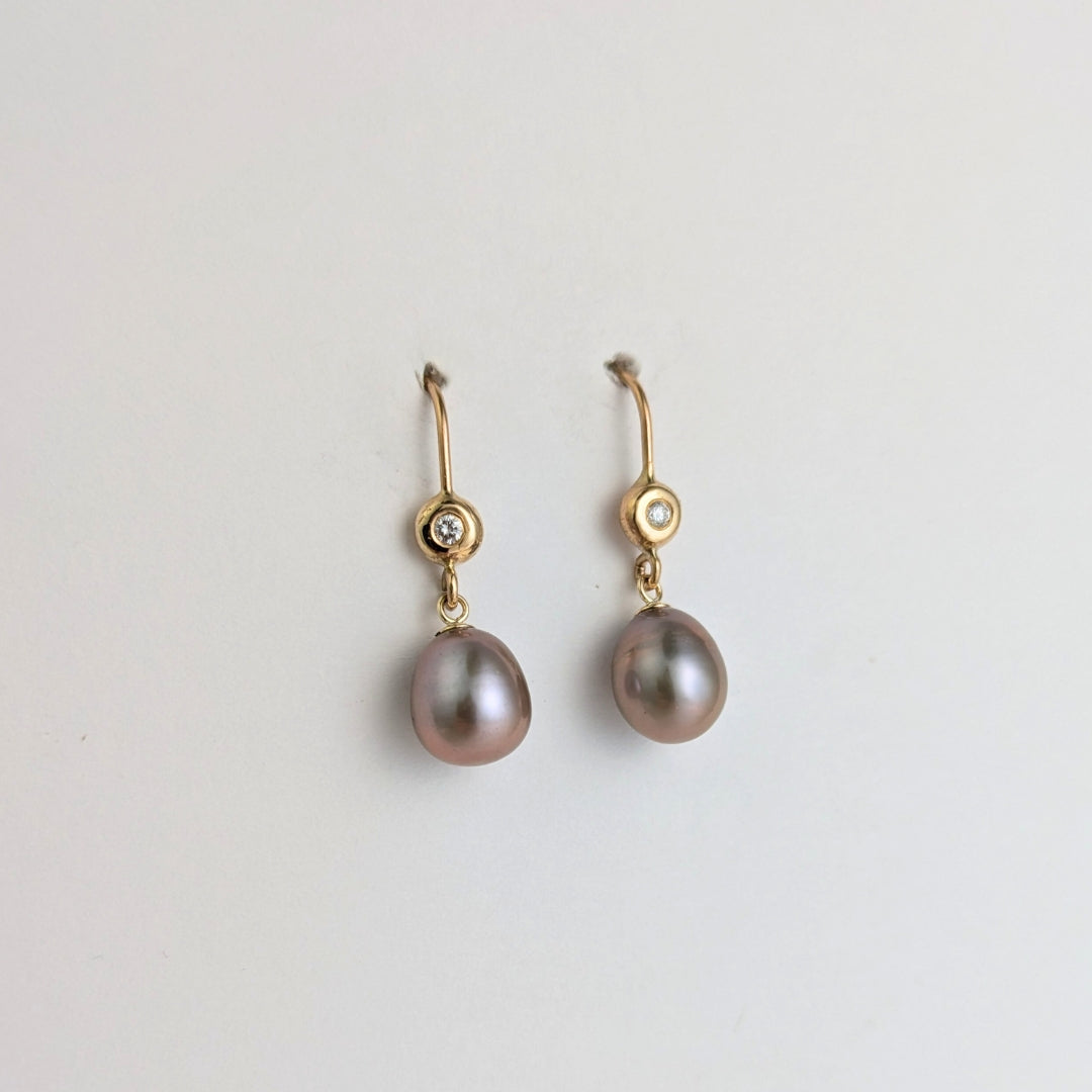 These 14k yellow gold earrings feature freshwater cultured pearls drops accented by flush set diamonds on the hooks.