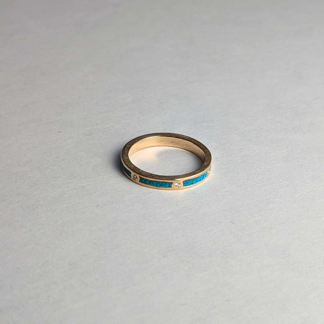 This gold stacker ring showcases a solid yellow band with alternating lines of turquoise crushed inlay and round diamonds.