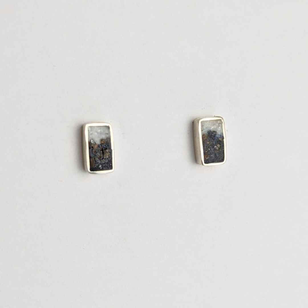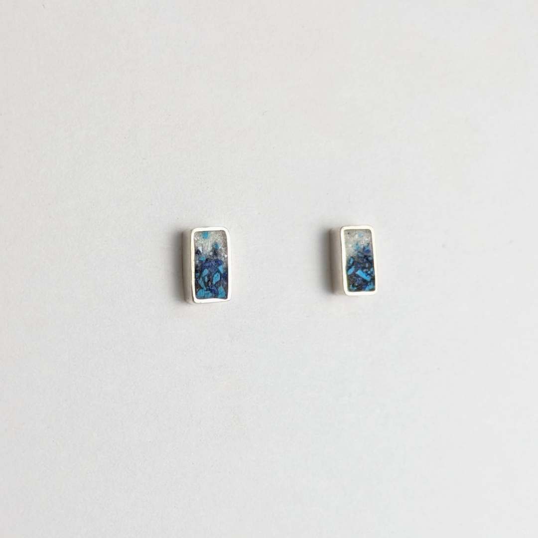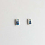 These mini rectangle studs are inlaid with a mixture of crushed gemstones at the base and gradates into crushed mother of pearl, making them perfect for everyday wear with a touch of natural beauty.