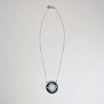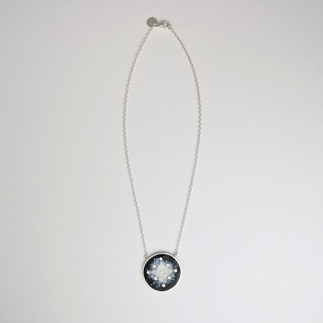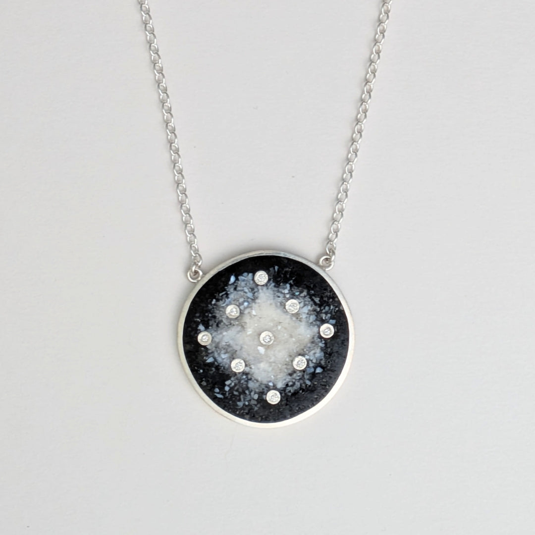 This statement necklace features a circular pendant with nine flush set diamonds in a sunburst pattern. Crushed black jet stone and mother of pearl are hand set with resin into the pendant which gradates from black to white. This pendant is attached to a sterling silver cable chain and is latched with a lobster clasp.