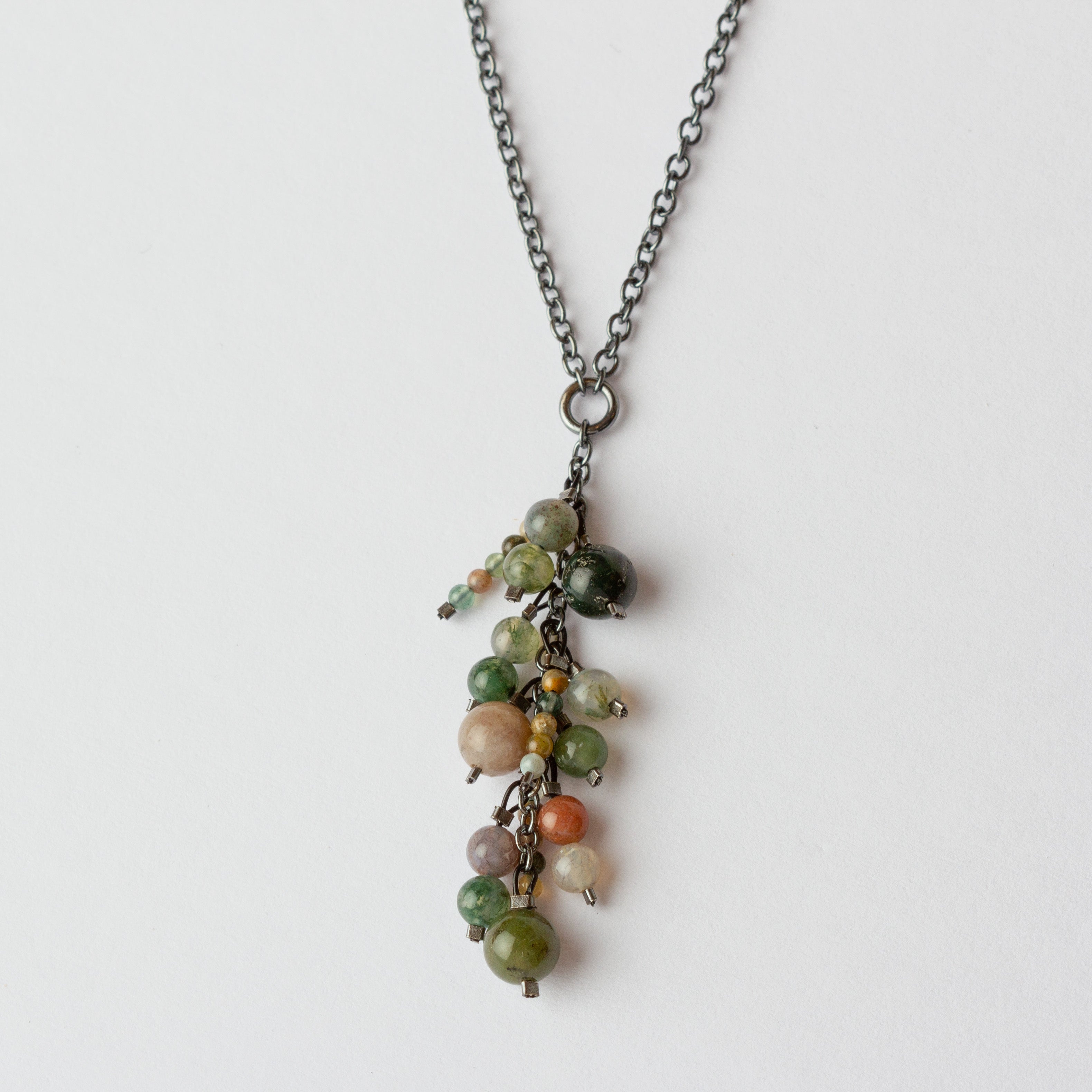 This Indian Agate Cluster Necklace boasts a majestic 2" drop, featuring high-quality Indian Agate gemstone beads suspended on a durable beading wire. Each one of these luxurious cluster necklaces is a unique, one-of-a-kind statement piece.