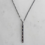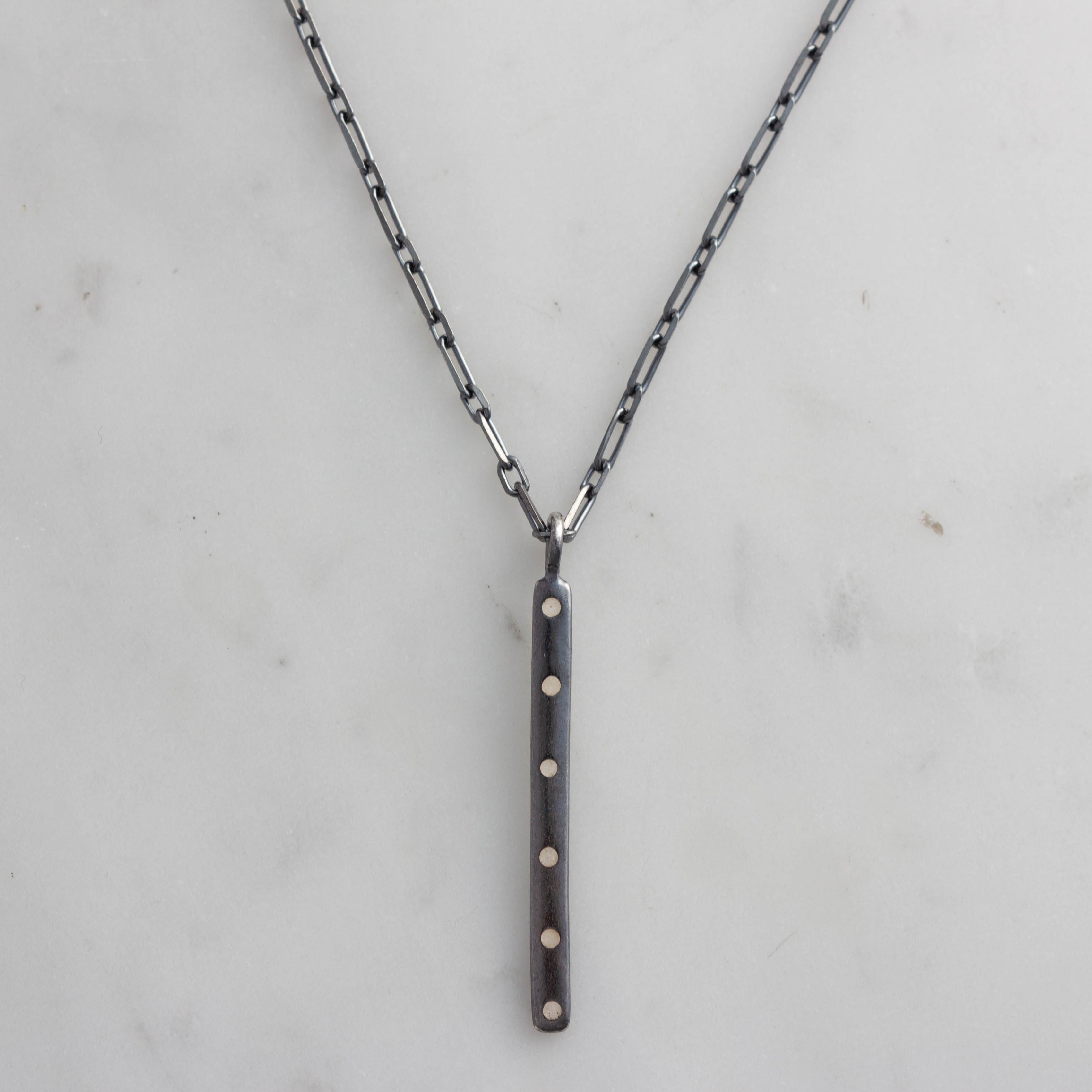 This stick pendant is a forged sterling silver bar with gemstone inlay of your choice on a sterling silver chain with lobster clasp.