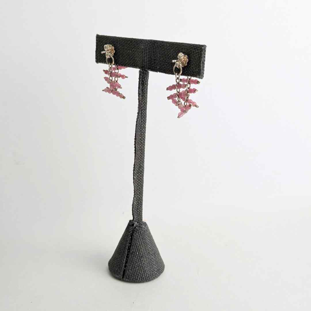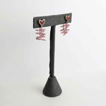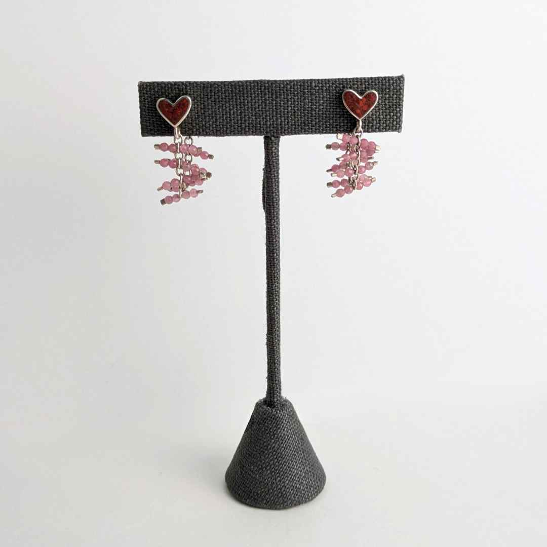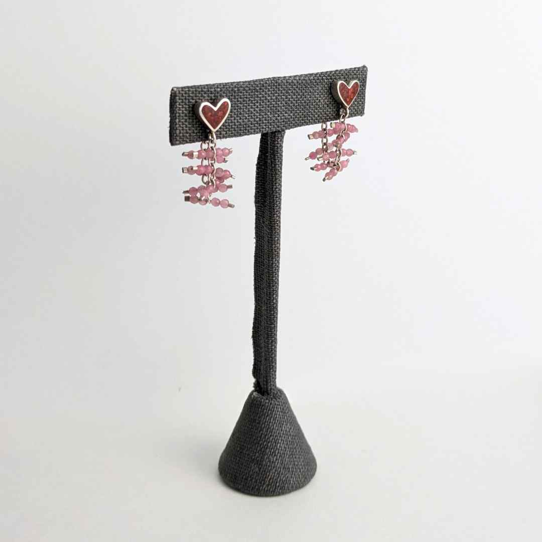 The Jasper Tether Studs are a fun earring with sparkle and movement. The heart stud features red jasper inlay with a pink tourmaline beaded chain connecting to the ear nut closure.