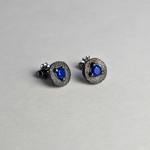 These studs showcase round lapis lazuli gemstones set into a textured, oxidized sterling silver stud, creating a unique and speckled appearance.