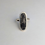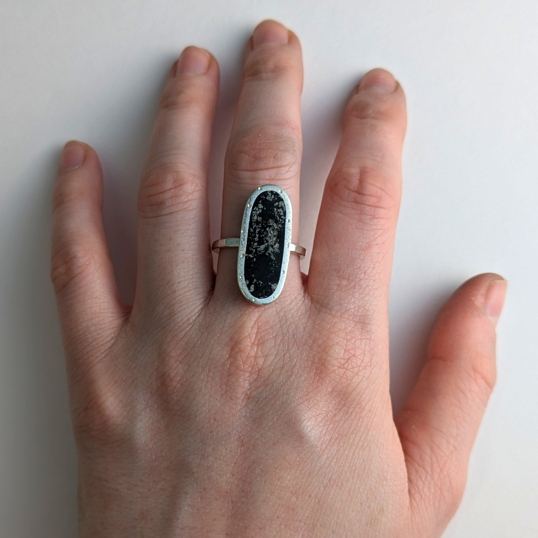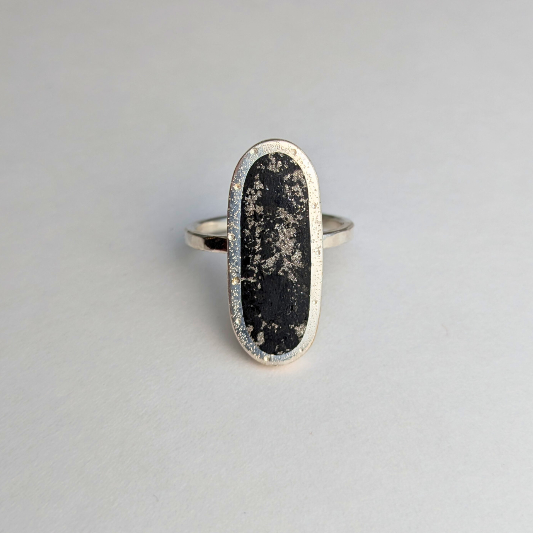 Crafted in the traditional orientation, the Oval Cocktail Ring boasts an elongated oval shape with a black jet stone accented by silver flecks in the recesses. The bezel is adorned with a speckled texture, while the band is hammered for a unique touch. The inlay bezel rests on the band, allowing for stacking with other slim rings.