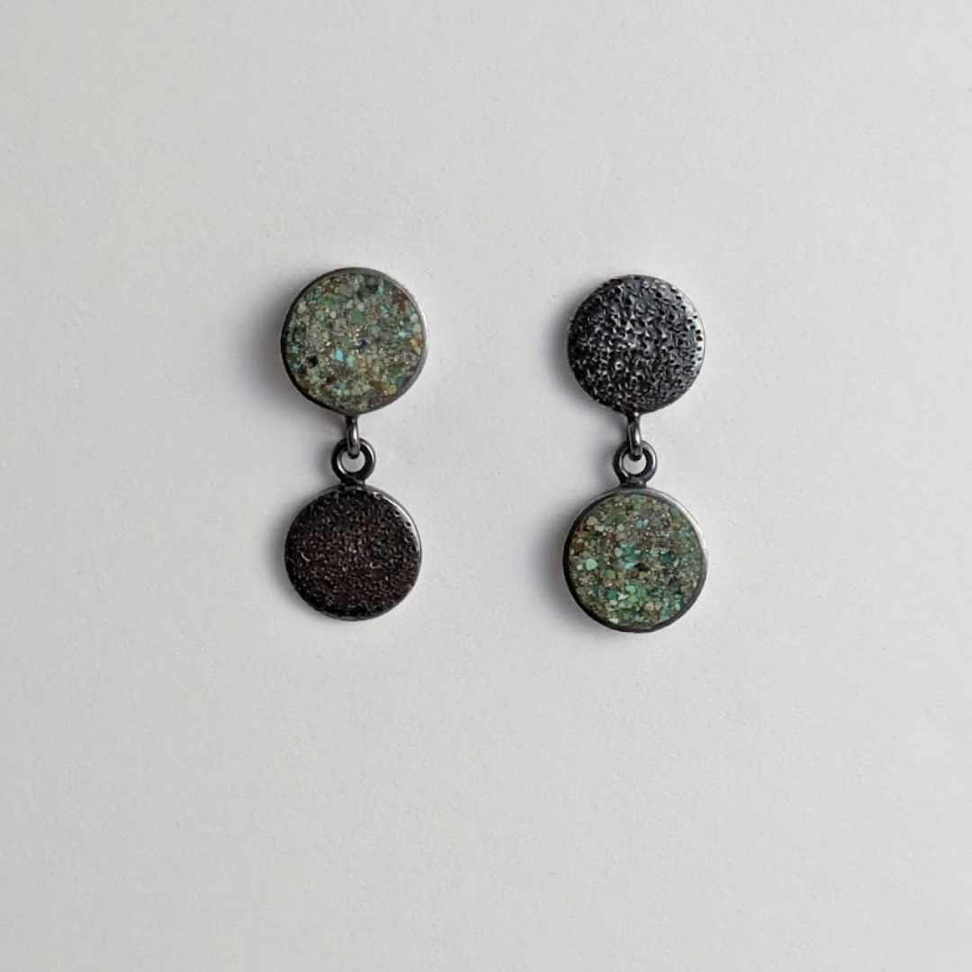 These stud earrings feature turquoise inlaid circles complimented by speckled textured circles in a mix- matched orientation.