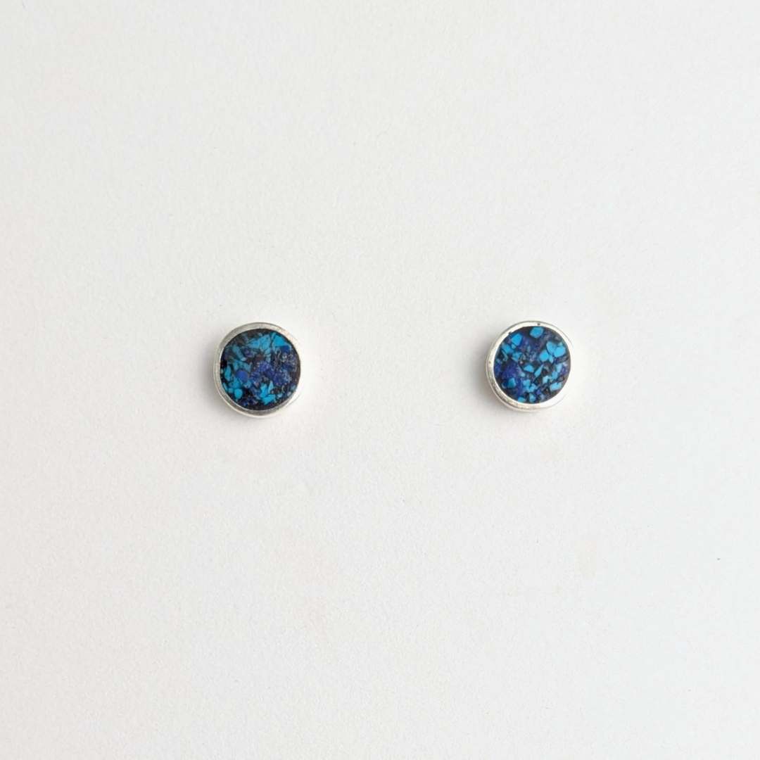 These studs feature a combination of crushed lapis lazuli and turquoise inlaid into these polished sterling silver stud earrings. They are great for ever day wear and comfortable too!