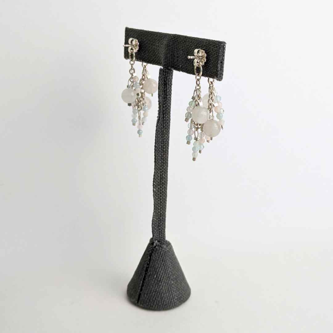 The Mother of Pearl Unis Studs are a fun earring with sparkle and movement. The circle stud features mother of pearl inlay with a mixture of large quartz and small beryl (aquamarine and morganite) beaded chain connected to the ear nut closure.