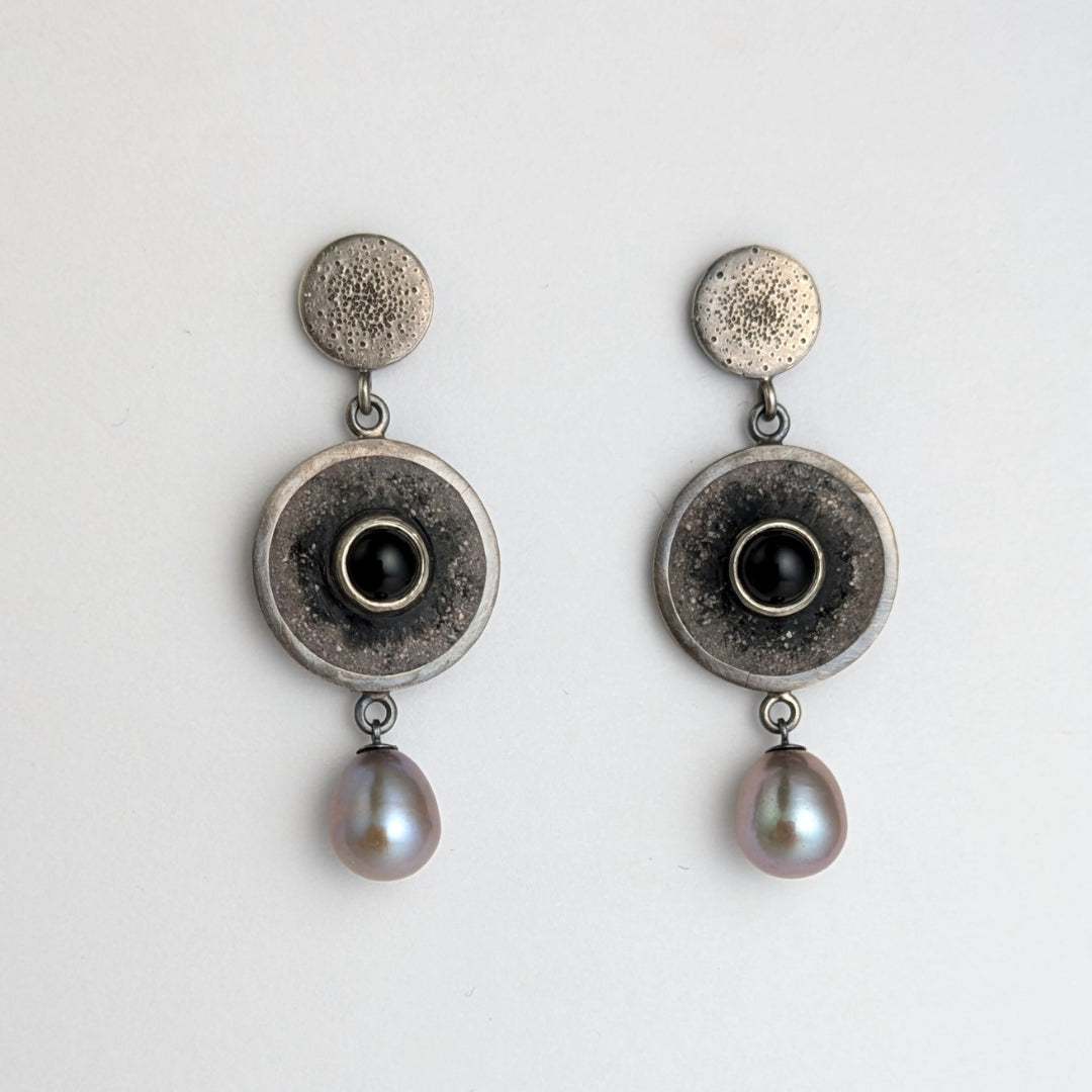 These fun earrings feature a bezel set 5mm onyx cabochon surrounded by black jet stone and pink rhodonite gemstone inlay. The circular stud tops are speckled texture to mimic the sunburst effect of the inlay. The studs are finished with a freshwater cultured pearl drop.