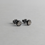 These oxidized sterling silver studs feature carved crisscrossing lines in a unique checkered pattern. The lines are meticulously carved and filled with mother of pearl inlay for a striking contrast. These abstract studs are perfect for everyday wear and sets itself apart from my other pieces with its use of inlaid lines instead of traditional bezels.