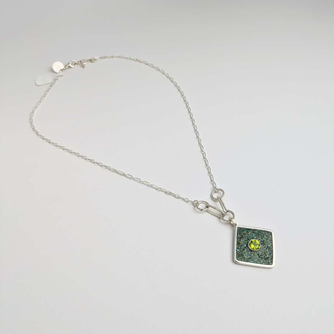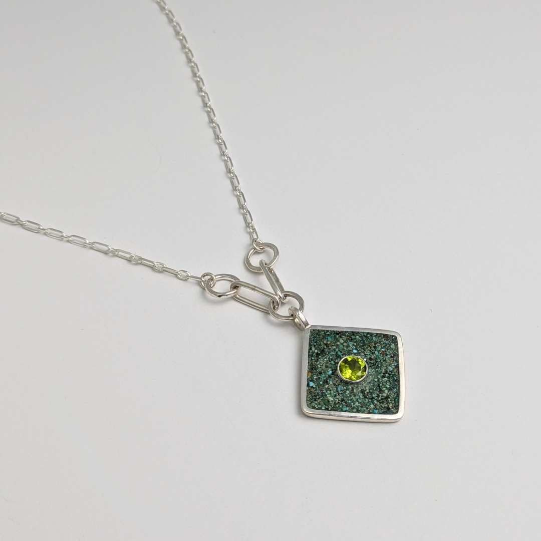 This necklace showcases a 6mm natural peridot surrounded by inlaid crushed green turquoise in a square shaped bezel. The pendant hangs on a sterling silver cable chain and is fastened by a lobster clasp.