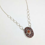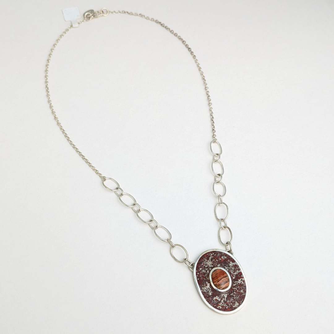 This sterling silver necklace features a bezel set red jasper gemstone surrounded by a hand inlaid crushed red jasper and silver flecks composite. This pendant hangs on a handmade oval signature sterling silver chain with a lobster clasp.