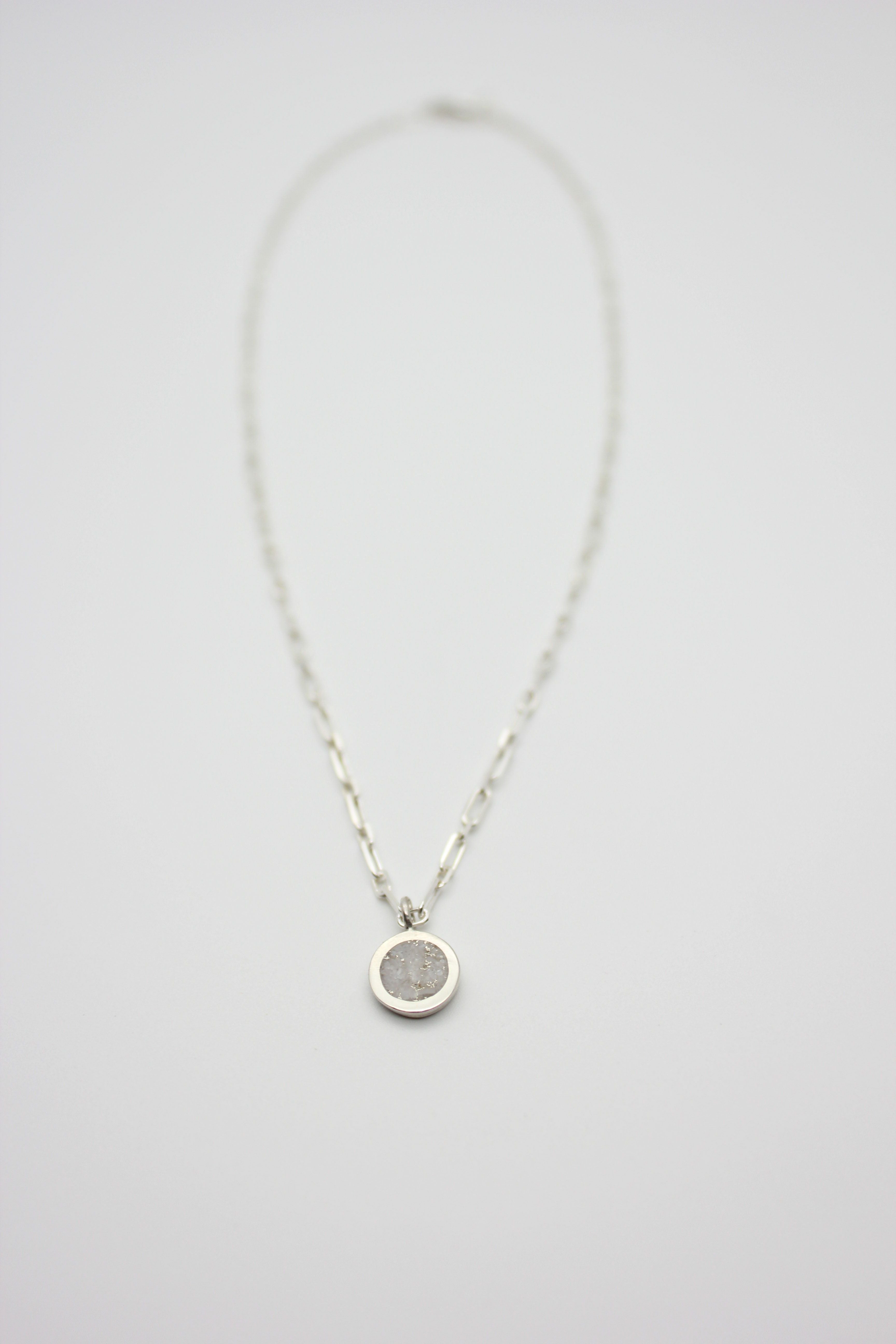 Pictured: Mother-of-pearl inlay with added silver flecks set into a polished sterling silver bezel on a polished chain.