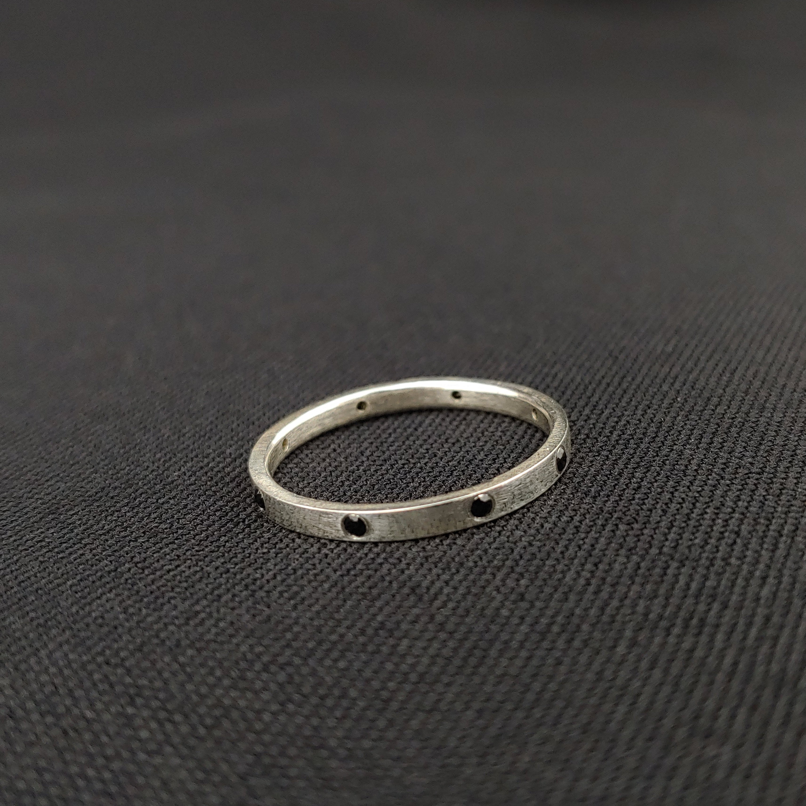 Pictured: Full eternity band of flush set black spinel gemstones in a polished sterling silver band.