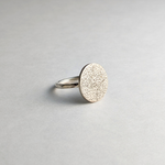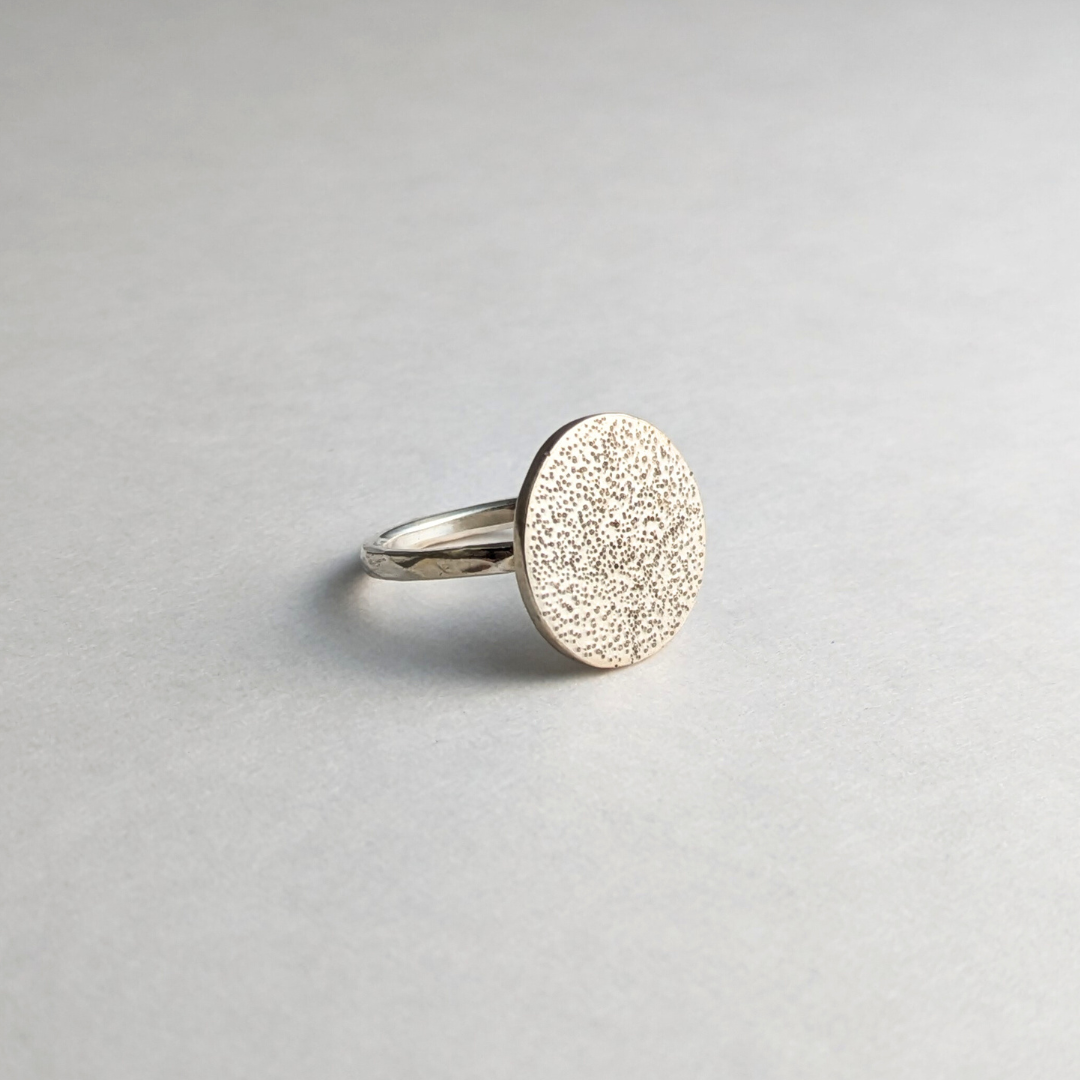 This speckled cocktail ring boasts a sizable round top and a hammered band, all crafted from sterling silver. The round top is enhanced with a finely speckled texture and soldered to the band making it perfect for layering with other slender rings.