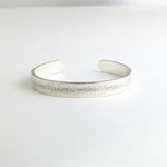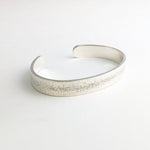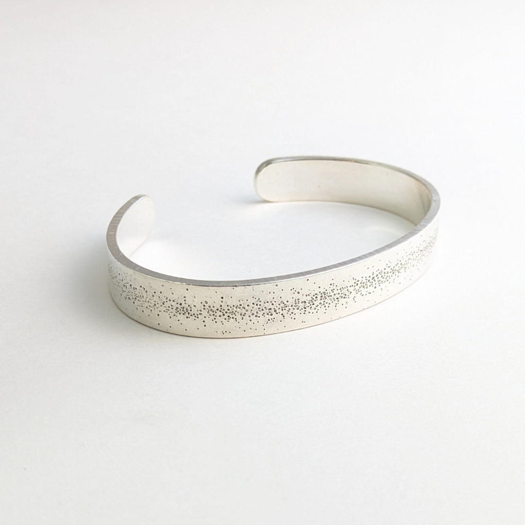 This wide cuff features speckle texture down the center of the cuff with back hammering on the sides for added shine.