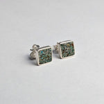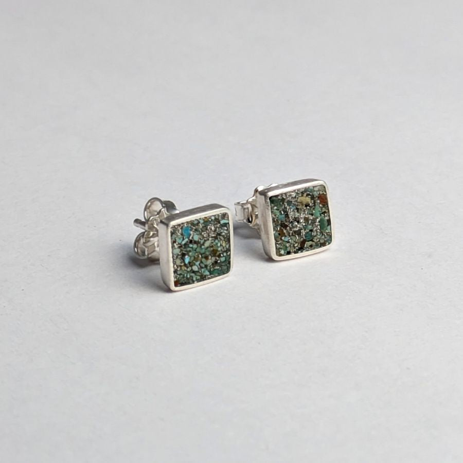 These silver square studs are adorned with crushed green turquoise inlay, making them perfect for everyday wear with a touch of natural beauty.