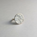 The Textured Cocktail Ring showcases a significant round top and a hammered band, made entirely of sterling silver. Its top features a textured surface treatment achieved through multiple sanding processes, and is completed with a hammer finished border.