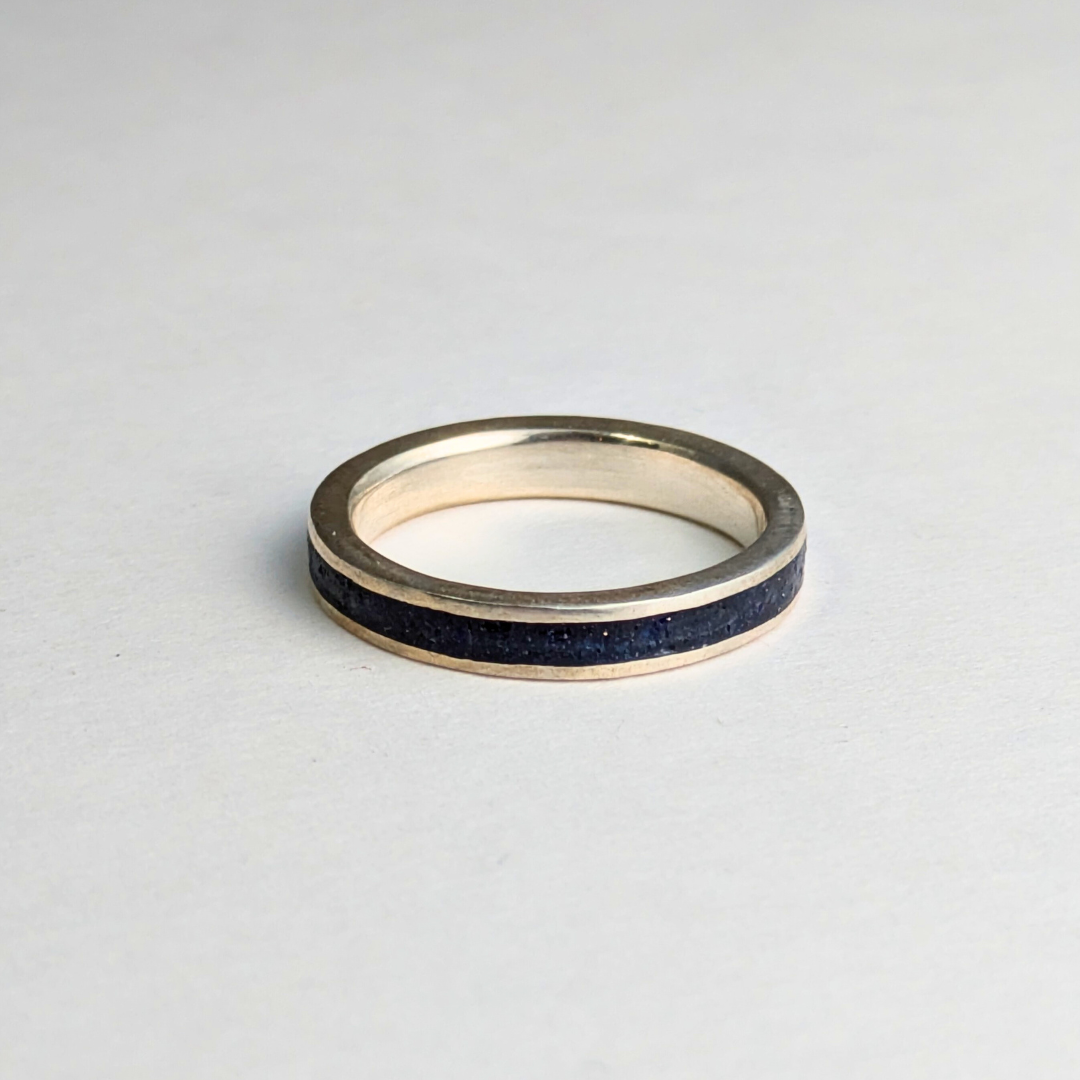 This ring boasts a continuous bluestone inlay encircling the entire band. Its 3mm width makes it an ideal stacking ring. Crafted from durable sterling silver.
