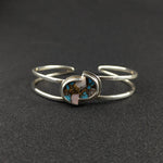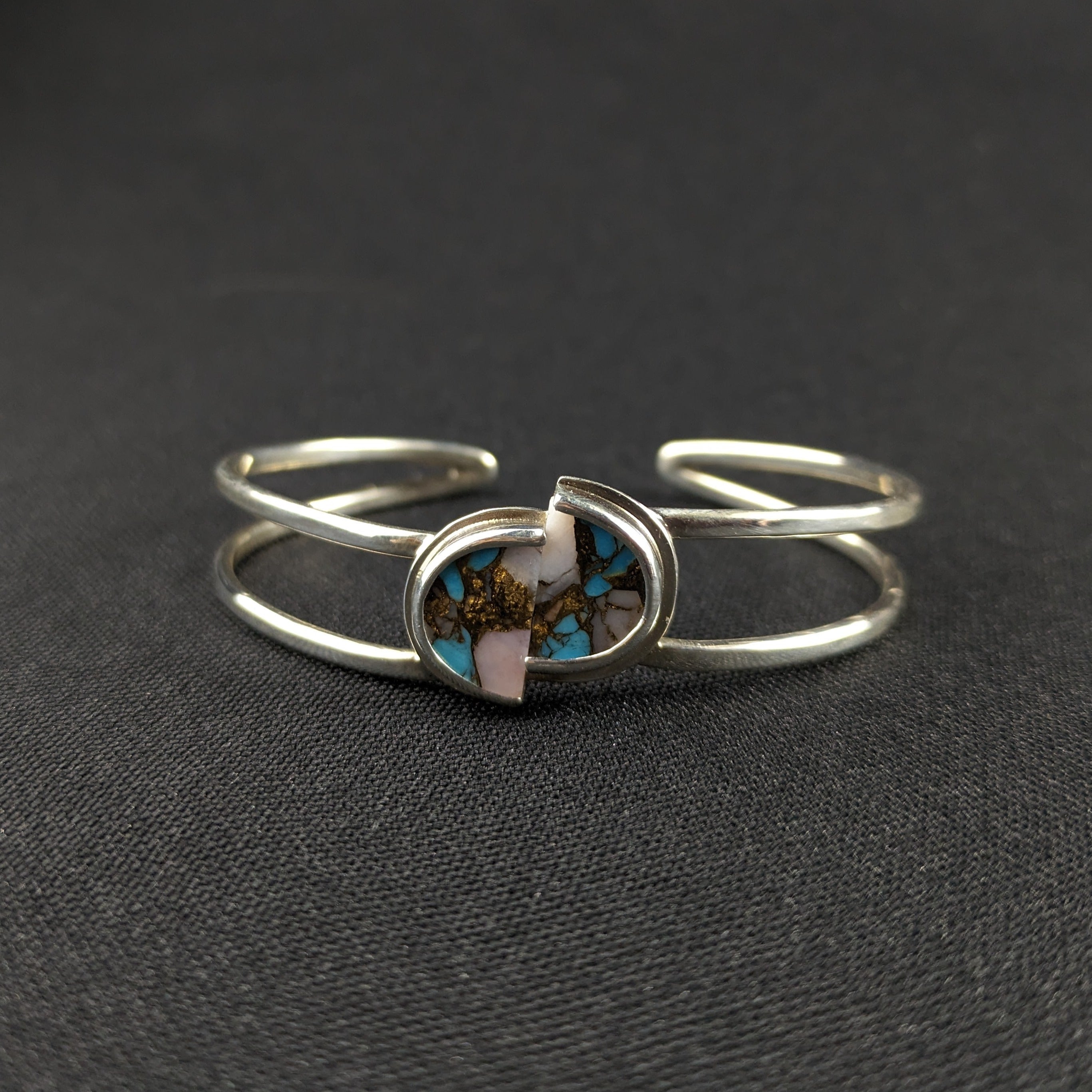 This bracelet features two bezel set turquoise and opal cabochons matched together to form the centerpiece of this cuff bracelet.
