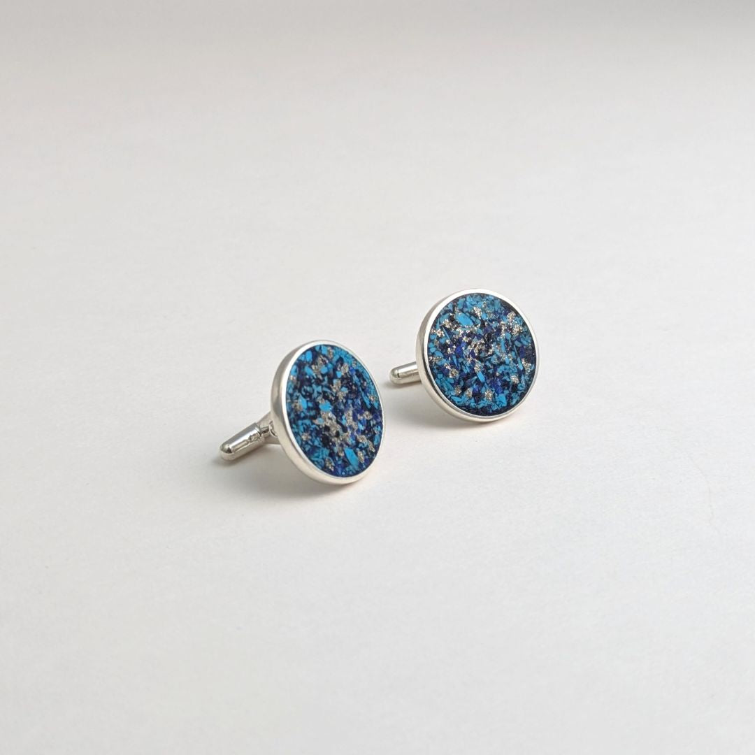 The cuff links contain a mixture of crushed turquoise, lapis lazuli and bluestone with silver flecks set into a brushed sterling silver bezel on a solid cuff link post.