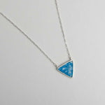 This triangle pendant features a mixture of crushed turquoise and mother of pearl set into sterling silver and finished with a sterling silver cable chain and lobster clasp.